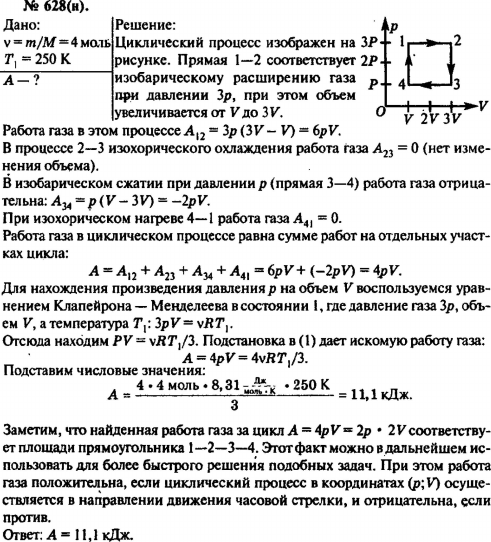Идеальный газ в количестве 4 моль изобарически нагревают при давлении 3р так, что его объем увеличивается в 3 раза. Затем газ изохорически охлаждают до давления р, после чего изобарически сжимают до первоначального объема и изохорически нагревают до начальной температуры Т1 = 250 К. Изобразить циклический процесс в координатах p,V и определить работу газа в этом процессе.