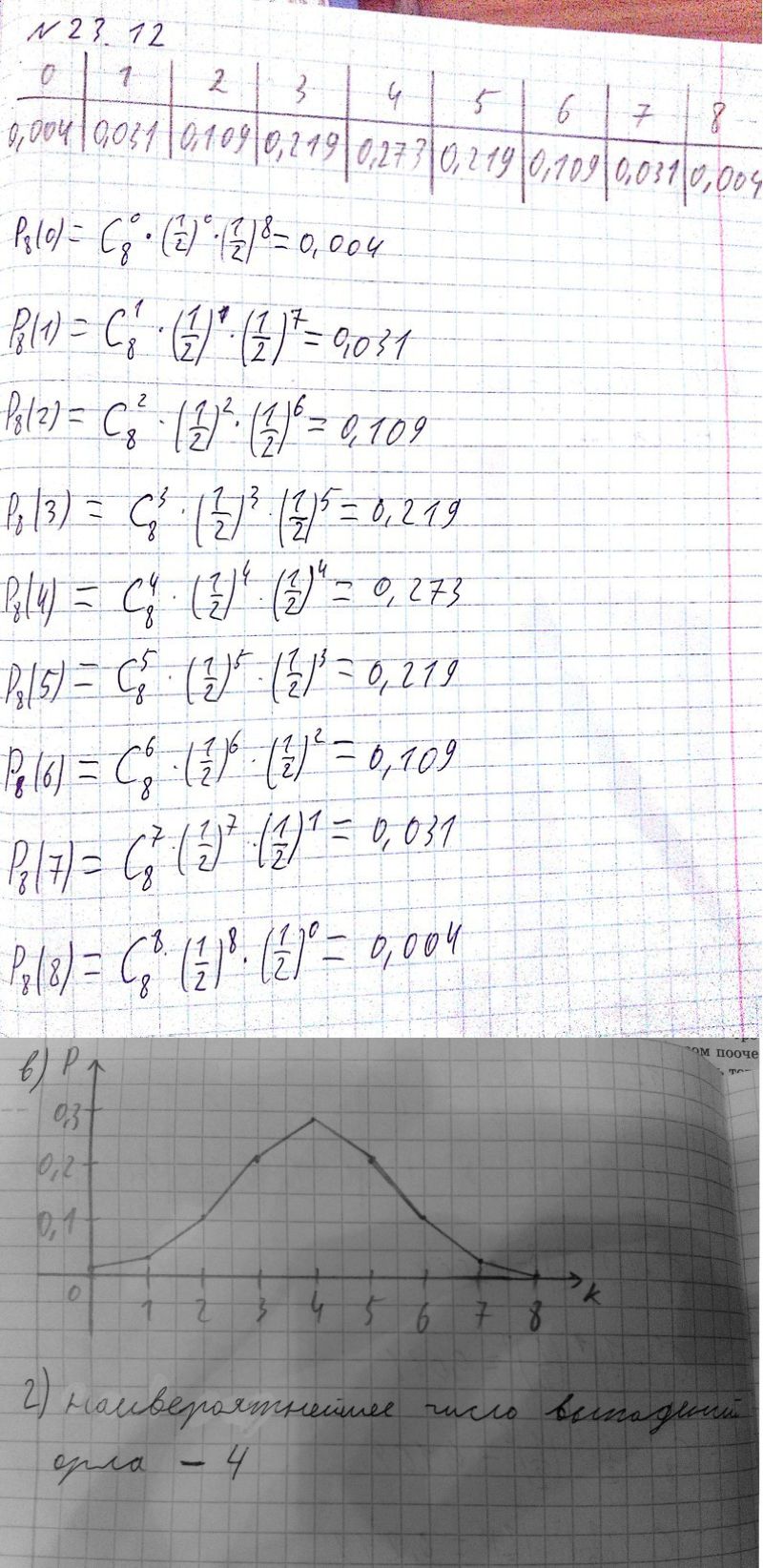23.12. При восьми бросаниях монеты орел может выпасть k = О, 1, 2, 3, 4, 5, 6, 7, 8 раз.