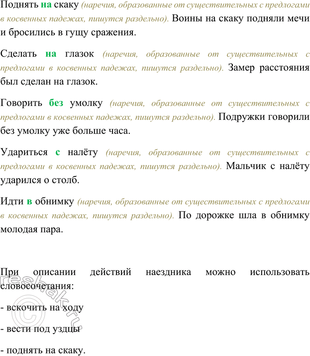 При описании действий наездника можно использовать словосочетания: вскочить на ходу, прыгнуть с разбегу, поднять на скаку.