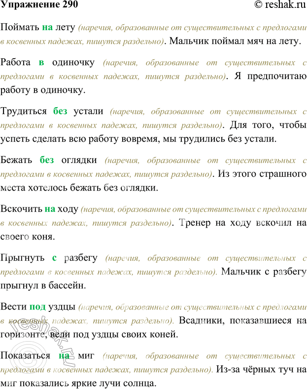 Поймать (на)лету, работа (в)одиночку, трудиться (без)устали, бежать (без)оглядки, вскочить (на)ходу, прыгнуть (с)разбегу, показаться (на)миг, поднять (на)скаку, сделать (на)глазок, говорить (без)умолку, удариться (с)налёту, идти (в)обнимку.