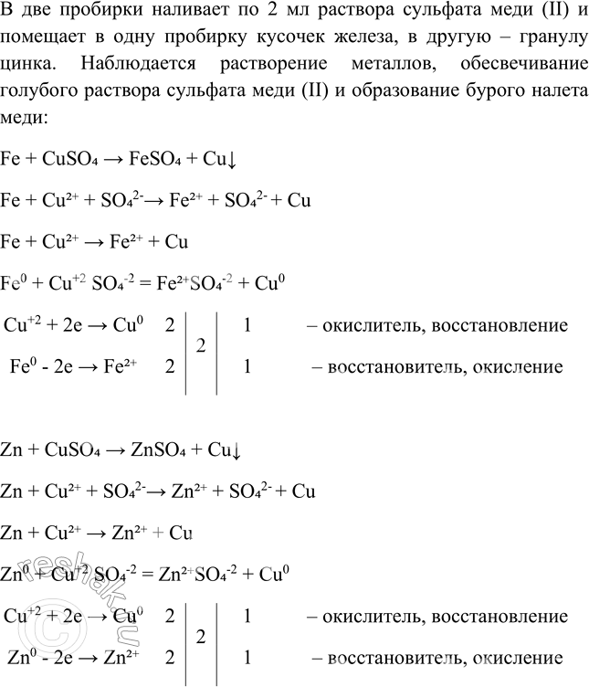 Налейте в две пробирки по 2 мл раствора сульфата меди (II), поместите в одну кусочек железа, в другую — гранулу цинка. Что наблюдаете? Запишите уравнения реакций в молекулярной и ионной формах. Рассмотрите окислительно-восстановительные процессы.