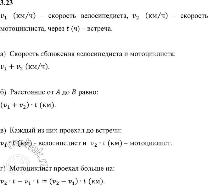 3.23. Из пунктов А и В одновременно навстречу друг другу выехали велосипедист со скоростью v1 км/ч и мотоциклист со скоростью v2 км/ч и встретились через t ч.