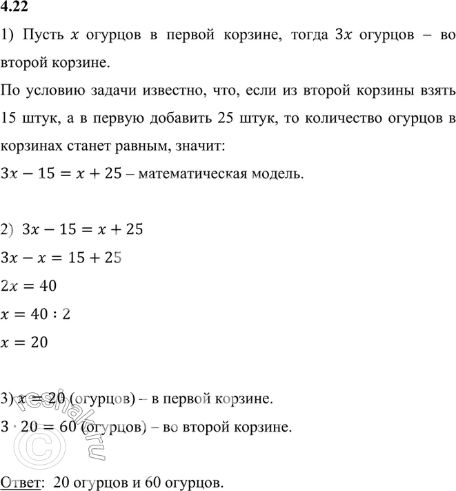 4.22. В одной корзине в 3 раза больше огурцов, чем в другой. Если из неё взять 15 штук огурцов, а в другую корзину добавить 25 штук, то в обеих корзинах огурцов станет поровну. Сколько огурцов было первоначально в каждой корзине?