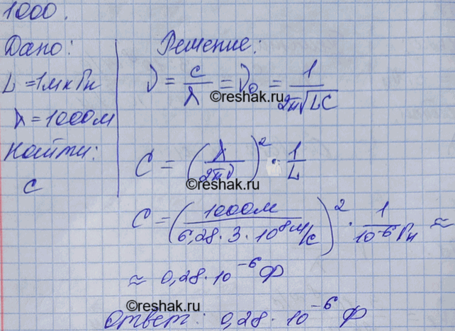 Катушка приемного контура радиоприемника имеет индуктивность 1 мкГн. Какова емкость конденсатора, если идет прием станции, работающей на длине волны 1000 м?