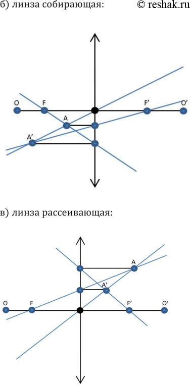 На рисунке 119 показаны положения главных оптических осей ОО', светящихся точек А и их изображений А'. Какие линзы (собирающие или рассеивающие) соответствуют рисункам а, б, в? Найти построением положение линз и их главных фокусов.
