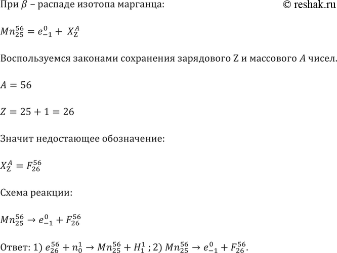 При бомбардировке железа 56Fe нейтронами образуется b-радиоактивный изотоп марганца с атомной массой 56. Написать реакцию получения искусственно радиоактивного марганца и реакцию происходящего с ним b-распада.