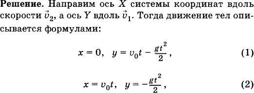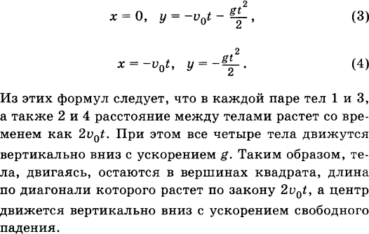 Из одной точки на достаточно большой высоте одновременно брошены четыре тела с одинаковыми по модулю скоростями v1 = v2 = v3 = v4 (рис. 34). По вершинам какой фигуры будут располагаться тела во время полета?