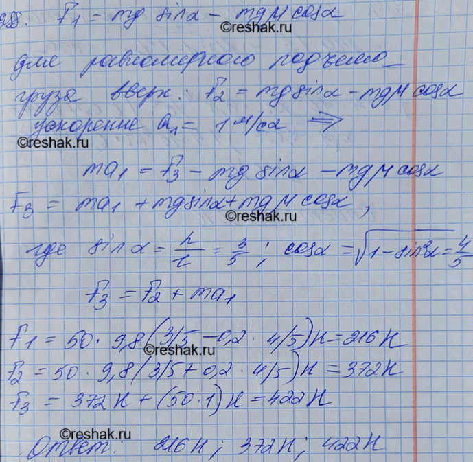 На наклонной плоскости длиной 5 м и высотой 3 м находится груз массой 50 кг. Какую силу, направленную вдоль плоскости, надо приложить, чтобы удержать этот груз? тянуть равномерно вверх? тянуть с ускорением 1 м/с2? Коэффициент трения 0,2.