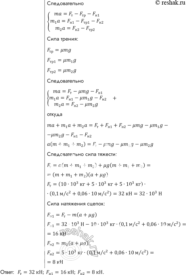 Маневровый тепловоз массой 100 т тянет два вагона массой по 50 т каждый с ускорением 0,1 м/с2. Найти силу тяги тепловоза и силу натяжения сцепок, если коэффициент сопротивления движению равен 0,006.