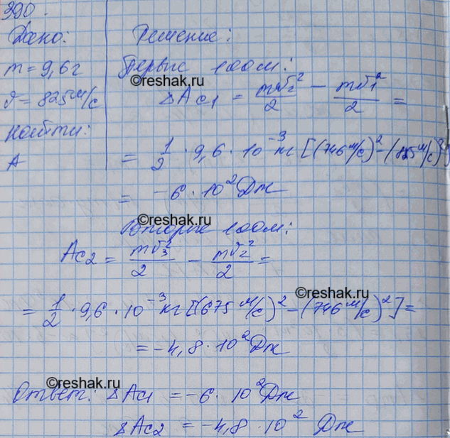 Пуля массой 9,6 г вылетает из ствола пулемета со скоростью 825 м/с. Через 100 м скорость пули уменьшается до 746 м/с, а через 200 м — до 675 м/с. Найти работу силы сопротивления воздуха на первых и вторых ста метрах пути.