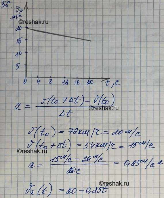 Скорость поезда за 20 с уменьшилась с 72 до 54 км/ч. Написать формулу зависимости скорости от времени vx(t) и построить график этой зависимости.