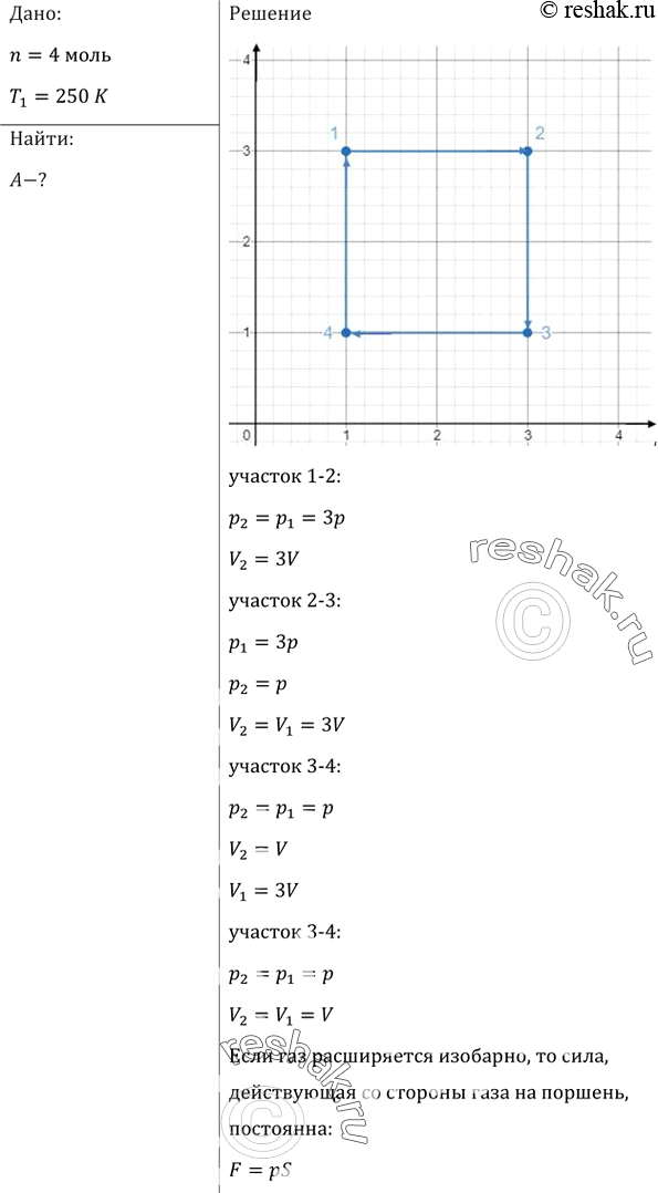 Идеальный газ в количестве 4 моль изобарически нагревают при давлении 3р так, что его объем увеличивается в 3 раза. Затем газ изохорически охлаждают до давления р, после чего изобарически сжимают до первоначального объема и изохорически нагревают до начальной температуры Т1 = 250 К. Изобразить циклический процесс в координатах p,V и определить работу газа в этом процессе.