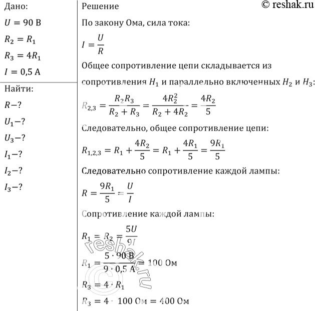 К цепи, показанной на рисунке 83, подведено напряжение 90 В. Сопротивление лампы Н2 равно сопротивлению лампы Н1, а сопротивление лампы НЗ в 4 раза больше сопротивления лампы Н1. Сила тока, потребляемая от источника, равна 0,5 А. Найти сопротивление каждой лампы, напряжение на лампах Н1 и НЗ и силу тока в них.