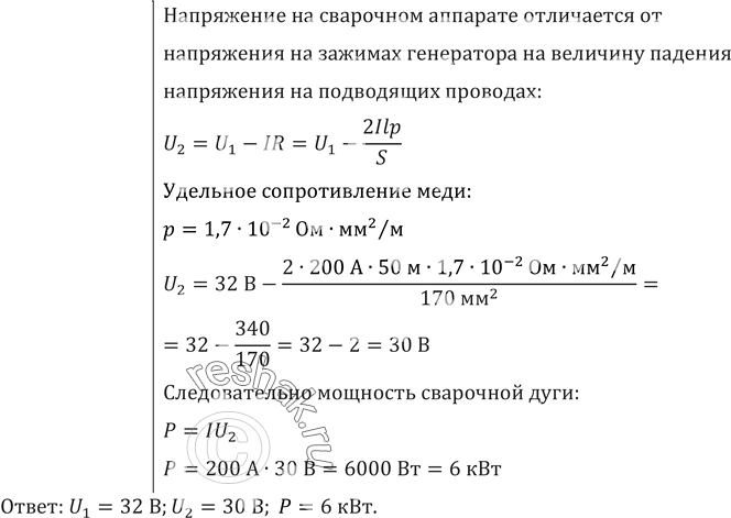 От генератора с ЭДС 40 В и внутренним сопротивлением 0,04 Ом ток поступает по медному кабелю площадью поперечного сечения 170 мм2 к месту электросварки, удаленному от генератора на 50 м. Найти напряжение на зажимах генератора и на сварочном аппарате, если сила тока в цепи равна 200 А. Какова мощность сварочной дуги?