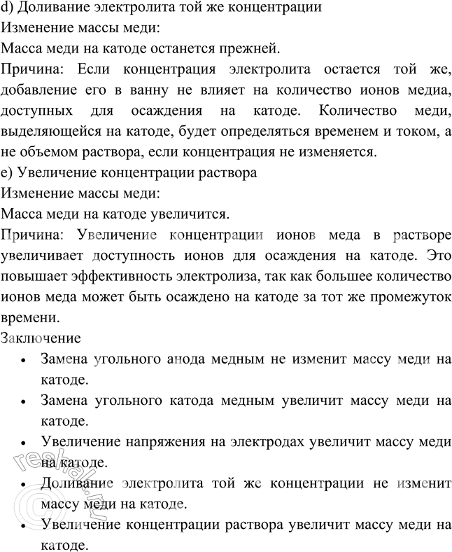 Электрический ток пропускают через электролитическую ванну, наполненную раствором медного купороса. Угольные электроды погружены в раствор приблизительно на половину своей длины. Как изменится масса меди, выделяющейся на катоде за один и тот же небольшой промежуток времени, если: а) заменить угольный анод медным такой же формы и объема; б) заменить угольный катод медным; в) увеличить напряжение на электродах; г) долить электролит той же концентрации; д) увеличить концентрацию раствора; е) сблизить электроды; ж) уменьшить погруженную часть анода; з) уменьшить погруженную часть катода; и) нагреть раствор электролита? При возможности проверить сделанные выводы на опыте (о массе выделяющейся меди можно судить по показаниям амперметра).