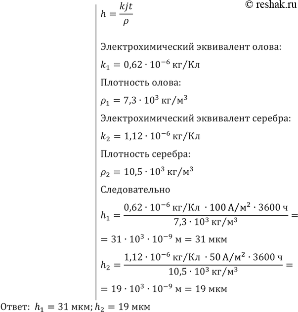 Используя решение предыдущей задачи, рассчитать толщину слоя, осевшего на изделие за 1 ч, при лужении (покрытие оловом) и серебрении. При лужении применяется плотность тока 1 А/дм2, а при серебрении — 0,5 А/дм2.