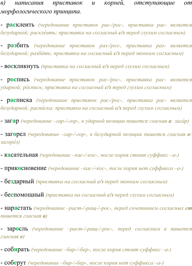 в) написания приставок и корней, отступающие от морфологического принципа.