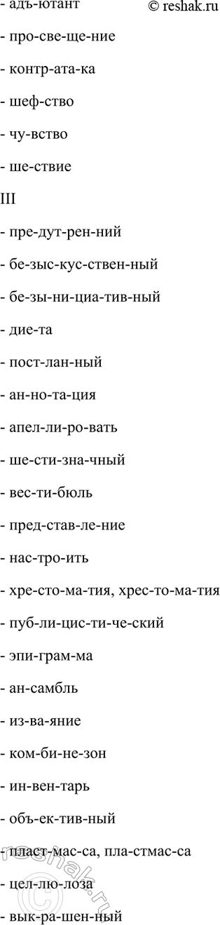 III. Предутренний, безыскусственный, безынициативный, диета, постланный, аннотация, апеллировать, шестизначный, вестибюль, представление, настроить, хрестоматия, публицистический, эпиграмма, ансамбль, изваяние, комбинезон, инвентарь, объективный, пластмасса, целлюлоза, выкрашенный.