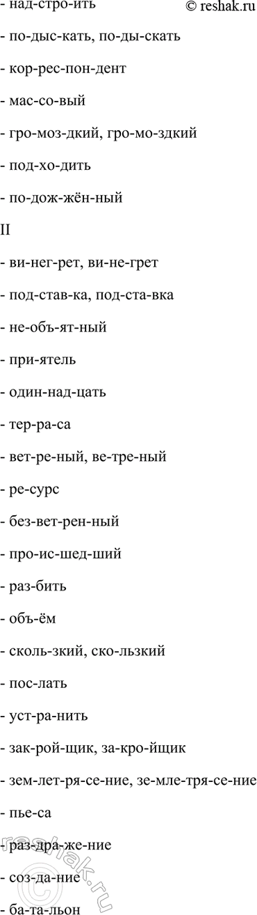 II. Винегрет, подставка, необъятный, приятель, одиннадцать, терраса, ветреный, ресурс, безветренный, происшедший, разбить, объём, скользкий, послать, устранить, закройщик, землетрясение, пьеса, раздражение, создание, батальон, адъютант, просвещение, контратака, шефство, чувство, шествие.