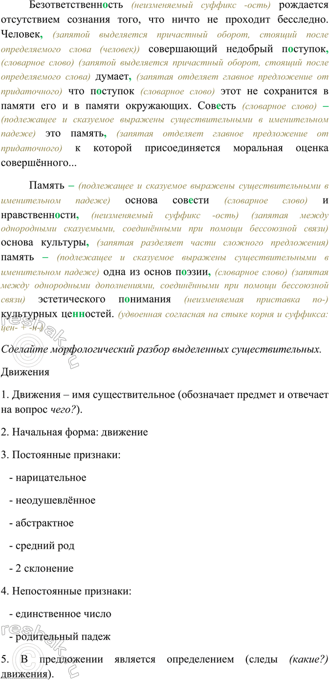 Безответственность (неизменяемый суффикс -ость) рождается отсутствием сознания того, что ничто не проходит бесследно. Человек, (запятой выделяется причастный оборот, стоящий после определяемого слова (человек)) совершающий недобрый поступок, (словарное слово) (запятой выделяется причастный оборот, стоящий после определяемого слова) думает, (запятая отделяет главное предложение от придаточного) что поступок (словарное слово) этот не сохранится в памяти его и в памяти окружающих. Совесть (словарное слово) – (подлежащее и сказуемое выражены существительными в именительном падеже) это память, (запятая отделяет главное предложение от придаточного) к которой присоединяется моральная оценка совершённого...