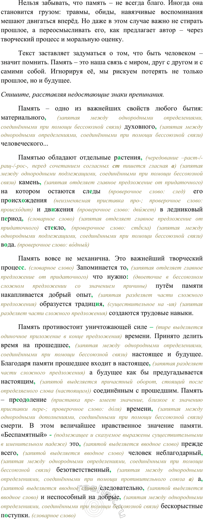 Память противостоит уничтожающей силе – (тире выделяется одиночное приложение в конце предложения) времени. Принято делить время на прошедшее, (запятая между однородными определениями, соединёнными при помощи бессоюзной связи) настоящее и будущее. Благодаря памяти прошедшее входит в настоящее, (запятая разделяет части сложного предложения) а будущее как бы предугадывается настоящим, (запятой выделяется причастный оборот, стоящий после определяемого слова (настоящим)) соединённым с прошедшим. Память – преодоление (приставка пре- имеет значение, близкое к значению приставки пере-; проверочное слово: доля) времени, (запятая между однородными дополнениями, соединёнными при помощи бессоюзной связи) смерти. В этом величайшее нравственное значение памяти. «Беспамятный» - (подлежащее и сказуемое выражены существительными в именительном падеже) это, (запятой выделяется вводное слово) прежде всего, (запятой выделяется вводное слово) человек неблагодарный, (запятая между однородными определениями, соединёнными при помощи бессоюзной связи) безответственный, (запятая между однородными определениями, соединёнными при помощи противительного союза а) а, (запятой выделяется вводное слово) следовательно, (запятой выделяется вводное слово) и неспособный на добрые, (запятая между однородными определениями, соединёнными при помощи бессоюзной связи) бескорыстные поступки. (словарное слово)
