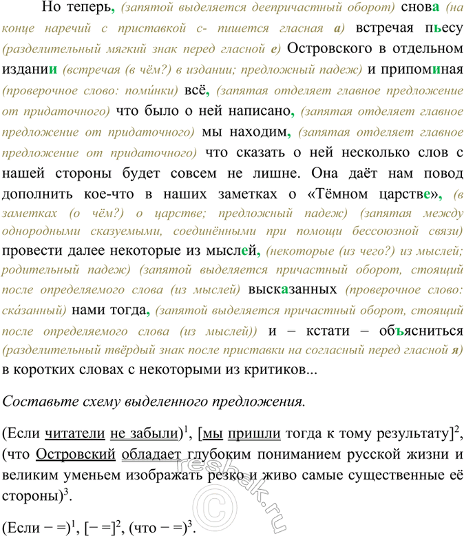 Но теперь, (запятой выделяется деепричастный оборот) снова (на конце наречий с приставкой с- пишется гласная а) встречая пьесу (разделительный мягкий знак перед гласной е) Островского в отдельном издании (встречая (в чём?) в издании; предложный падеж) и припоминая (проверочное слово: поминки) всё, (запятая отделяет главное предложение от придаточного) что было о ней написано, (запятая отделяет главное предложение от придаточного) мы находим, (запятая отделяет главное предложение от придаточного) что сказать о ней несколько слов с нашей стороны будет совсем не лишне. Она даёт нам повод дополнить кое-что в наших заметках о «Тёмном царстве», (в заметках (о чём?) о царстве; предложный падеж) (запятая между однородными сказуемыми, соединёнными при помощи бессоюзной связи) провести далее некоторые из мыслей, (некоторые (из чего?) из мыслей; родительный падеж) (запятой выделяется причастный оборот, стоящий после определяемого слова (из мыслей) высказанных (проверочное слово: сказанный) нами тогда, (запятой выделяется причастный оборот, стоящий после определяемого слова (из мыслей)) и – кстати – объясниться (разделительный твёрдый знак после приставки на согласный перед гласной я) в коротких словах с некоторыми из критиков...