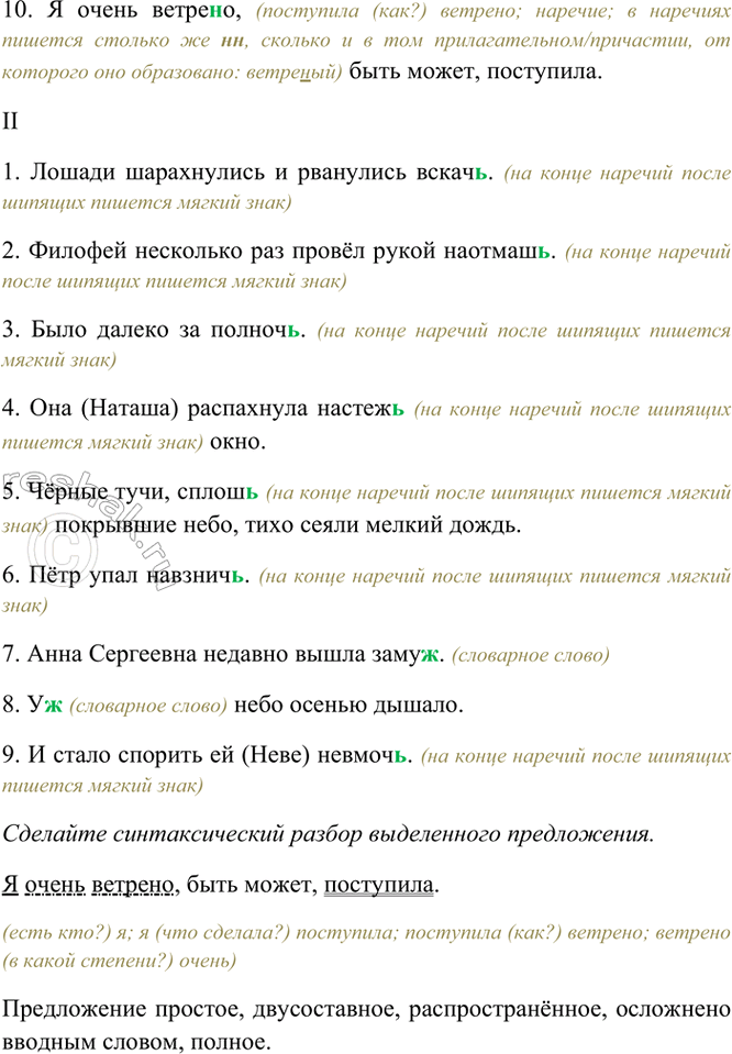 II. 1) Лошади шарахнулись и рванулись вскач(?). (Па-уст.) 2) Филофей несколько раз провёл рукой наотмаш(?). (Т.) 3) Было далеко за полноч(?). (Г.) 4) Она [Наташа] распахнула настеж(?) окно. (А. Г.) 5) Чёрные тучи, сплош(?) покрывшие небо, тихо сеяли мелкий дождь. (Нов.-Пр.) 6) Пётр упал навзнич(?). (Нов.-Пр.) 7) Анна Сергеевна недавно вышла замуж(?). (Т.) 8) Уж(?) небо осенью дышало. (П.) 9) И стало спорить ей [Неве] невмоч.. . (П.)