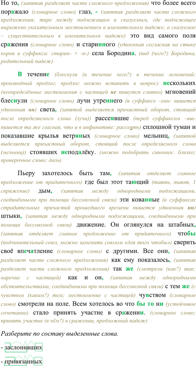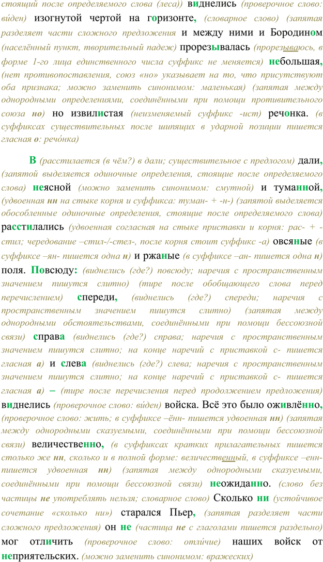 Поднявшись на курган, (запятой выделяется деепричастный оборот) Пьер замер (чередование –мир-/-мер-, после корня нет суффикса –а-) от восхищения (словарное слово) перед невиданной (слово без частицы не употреблять нельзя; в суффиксах страдательных причастий прошедшего времени пишется удвоенная нн) красотой зрелища. (словарное слово) Это была та же (панорама (какая?) та; местоимение с частицей) панорама, (словарное слово) (запятая отделяет главное предложение от придаточного) которой он любовался отсюда (любовался (откуда?) отсюда; наречия пишутся слитно) вчерашним (вечером (каким?) вчерашним) ветреным (словарное слово) вечером. Однако теперь всё было покрыто войсками, (запятой выделяется причастный оборот, стоящий после определяемого слова (войсками)) преодолевавшими (словарное слово; войсками (какими?) преодолевавшими) множество препятствий, (словарное слово) (запятой выделяется причастный оборот, стоящий после определяемого слова (войсками) и дымом выстрелов, (запятая разделяет части сложного предложения) и косые лучи яркого поднимавшегося (чередование –ним-/-ня-, после корня стоит суффикс –а-; солнца (какого?) поднимавшегося) сзади (поднимавшегося (где?) сзади; наречия с пространственным значением пишутся слитно) солнца кидали на местность (проверочное слово: место) свет золотистый с розоватым оттенком. (словарное слово) Дальние леса, (запятой выделяется причастный оборот, стоящий после определяемого слова (леса)) точно высеченные (проверочное слово: сечь; в суффиксах страдательных причастий прошедшего времени пишется удвоенная нн) из драгоценного (в суффиксе –енн- пишется удвоенная нн) жёлто-зелёного (сложные прилагательные со значением оттенка цвета пишутся через дефис) камня, (запятой выделяется причастный оборот, стоящий после определяемого слова (леса)) виднелись (проверочное слово: виден) изогнутой чертой на горизонте, (словарное слово) (запятая разделяет части сложного предложения и между ними и Бородином (населённый пункт, творительный падеж) прорезывалась (прорезываюсь, в форме 1-го лица единственного числа суффикс не меняется) небольшая, (нет противопоставления, союз «но» указывает на то, что присутствуют оба признака; можно заменить синонимом: маленькая) (запятая между однородными определениями, соединёнными при помощи противительного союза но) но извилистая (неизменяемый суффикс -ист) речонка. (в суффиксах существительных после шипящих в ударной позиции пишется гласная о: речонка)