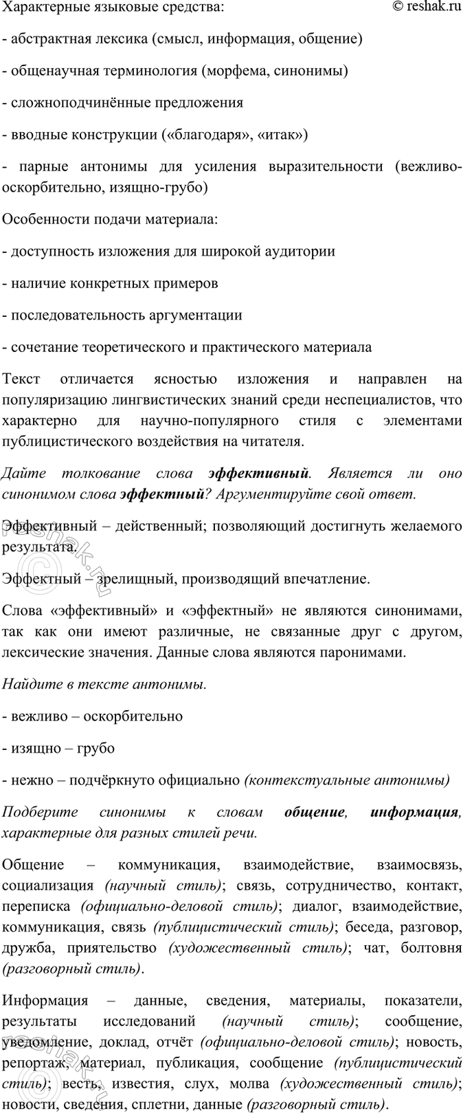 47. Спишите, вставляя недостающие знаки препинания, пропущенные буквы, раскрывая скобки. Прочитайте текст, перескажите его; дополните рассказ своими примерами. Определите стиль речи текста, обоснуйте свой ответ. Дайте толкование слова эффективный. Является ли оно синонимом слова эффектный? Аргументируйте свой ответ. Найдите в тексте антонимы. Подберите синонимы к словам общение, информация, характерные для разных стилей речи.