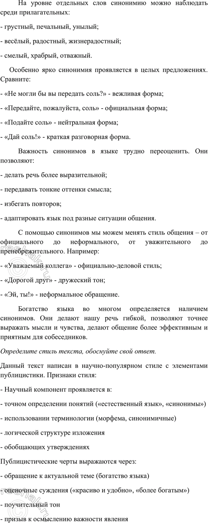 Стиль речи текста является учебно-научным. Это вид стиля, который характеризуется использованием объективного, нейтрального языка, стремлением передать информацию точно и без эмоциональной окрашенности. В тексте приводятся примеры синонимов, объясняется их роль и значение в языке.