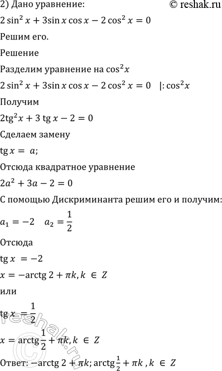 2) 2 sin2 x + 3 sin x cos x - 2 cos2 x = 0.