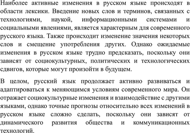 Наиболее активные изменения в русском языке происходят в области лексики. Введение новых слов и терминов, связанных с технологиями, наукой, информационными системами и социальными явлениями, является характерным для современного русского языка. Также происходит изменение значения некоторых слов и смещение употребления других. Однако ожидаемые изменения в русском языке трудно предсказать, поскольку они зависят от социокультурных, политических и технологических сдвигов, которые могут произойти в будущем.