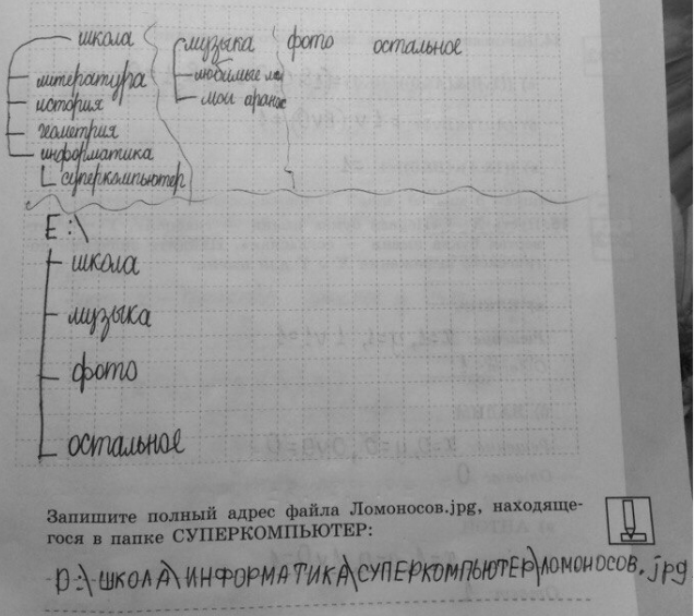 Ha флешке Ивана все файлы размещены в четырех папках: ШКОЛА. МУЗЫКА. ФОТО п ОСТАЛЬНОЕ. B папке ШКОЛА есть вложенные папки ЛИТЕРАТУРА, ИСТОРИЯ. ГЕОМЕТРИЯ. ИНФОРМАТИКА. B папке МУЗЫКА есть вложенные папки ЛЮБИМЫЕ МЕЛОДИИ и МОИ АРАНЖИРОВКИ. B папке ФОТО находились вложенные папки СУПЕРКОМПЬЮТЕР, ЭКСКУРСИИ и КАНИКУЛЫ, но папку СУПЕРКОМПЬЮТЕР Иван перенес в папку ИНФОРМАТИКА.