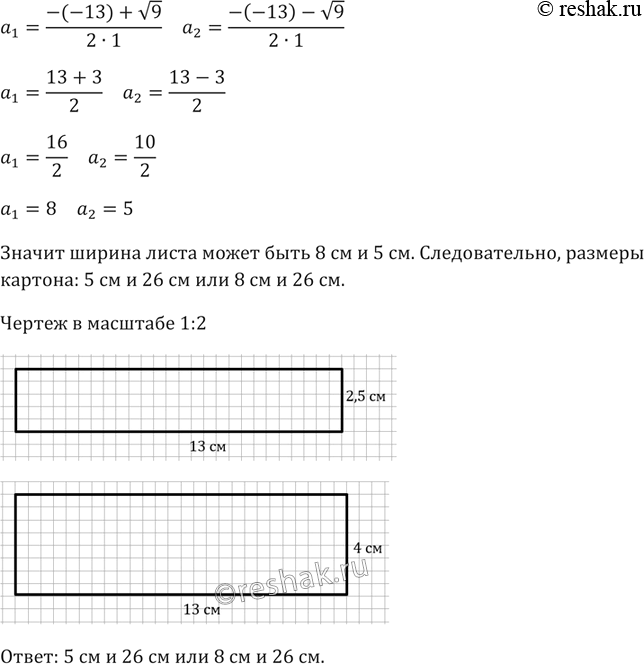 От прямоугольного листа картона длиной 26 см отрезали с двух сторон квадраты, сторона каждого из которых равна ширине листа. Площадь оставшейся части равна 80 см2. Найдите ширину листа картона. Покажите, что задача имеет два решения, и для каждого случая сделайте чертеж (в масштабе 1 : 2).