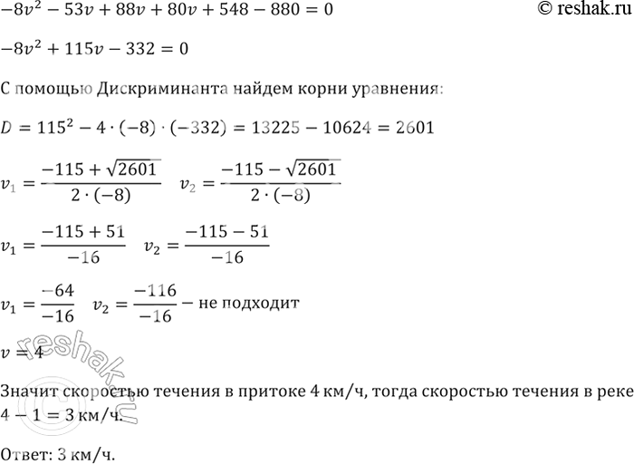 Моторная лодка прошла 35 км вверх по реке и на 18 км поднялась по её притоку, затратив на весь путь 8 ч. Скорость течения в реке на 1 км/ч меньше скорости течения в её притоке. Найдите скорость течения в реке, если скорость лодки в стоячей воде 10 км/ч.