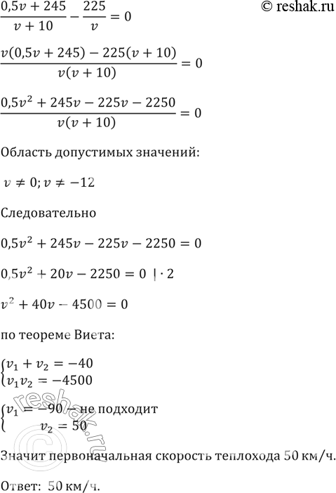 Теплоход отправился от пристани А до пристани В, расстояние между которыми 225 км. Через 1,5 ч после отправления он был задержан на 1/2 ч и, чтобы прийти в пункт назначения вовремя, увеличил скорость на 10 км/ч. Найдите первоначальную скорость теплохода.