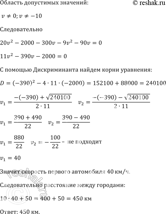 Из двух городов А и В выходят одновременно два автомобиля и встречаются через 5 ч. Скорость автомобиля, выходящего из А, на 10 км/ч меньше скорости другого автомобиля. Если бы первый автомобиль вышел из А на 4*1/2 ч раньше второго, то встреча произошла бы в 150 км от В. Найдите расстояние между городами А и В.