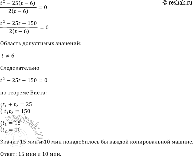 При совместной работе двух копировальных машин можно снять ксерокопию с рукописи за 6 мин. Если сначала снять ксерокопию с половины рукописи одной машиной, а затем с оставшейся части — другой машиной, то вся работа будет закончена через 12,5 мин. За какое время можно снять ксерокопию с рукописи каждой машиной в отдельности?