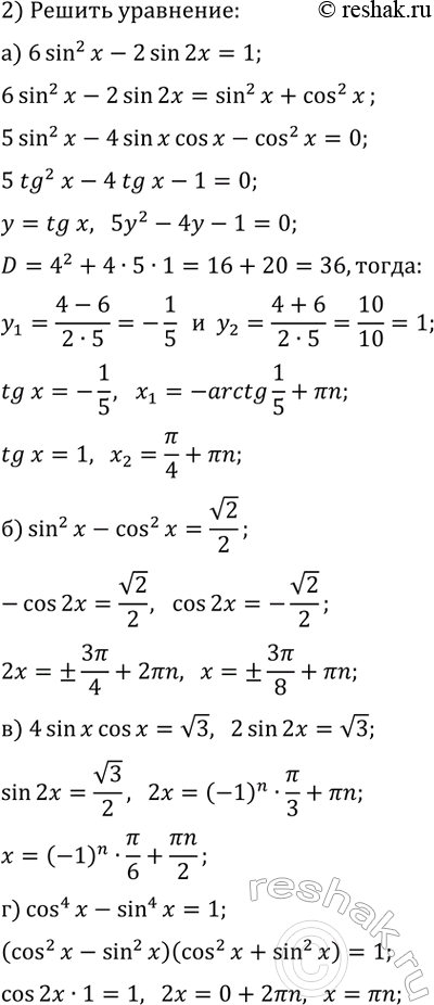 2) а) 6sin^2(x)-2sin(2x)=1; б) sin^2(x)-cos^2(x)=v2/2;