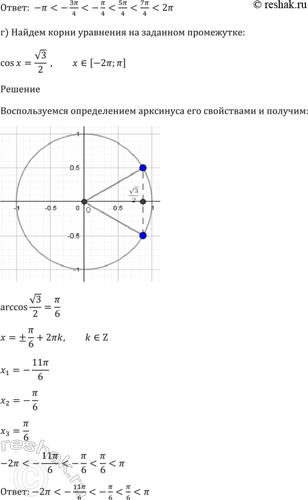 г) cos x = корень(3)/2, х принадлежит [-2пи; пи].