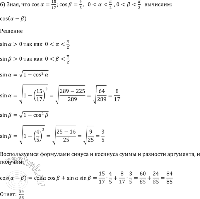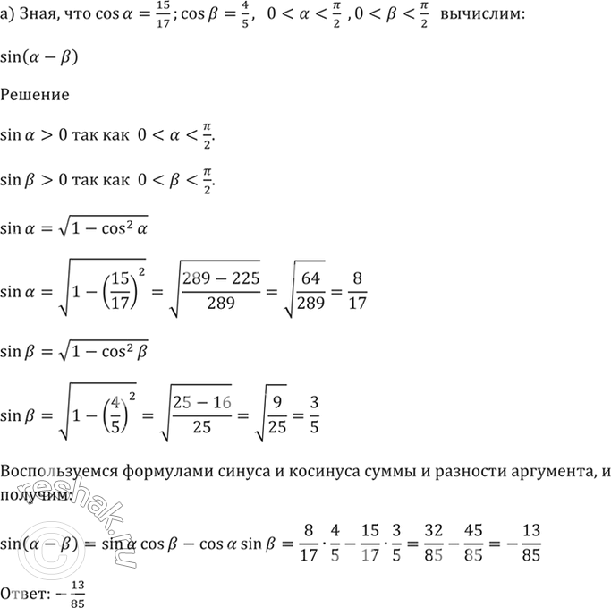 19.26 Зная, что cos a = 15/17, cos b = 4/5, 0 < a < пи, 0 < b < пи/2, найдите значение выражения: