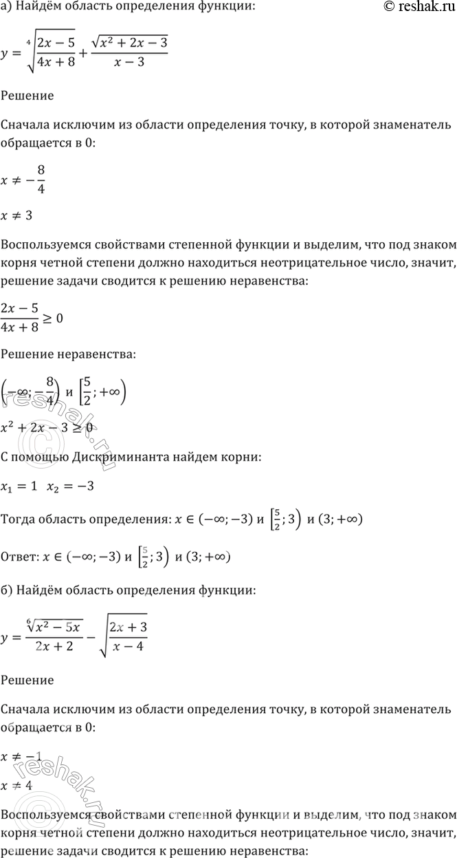 а) y = (4)корень((2x - 5)(4x + 8)) + корень(x^2 + 2x - 3)/(x-3);