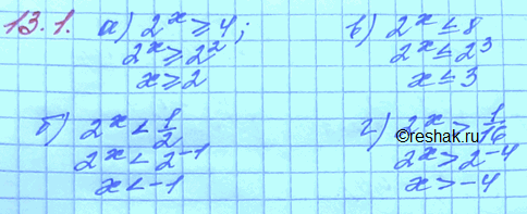 13.1. а) 2х больше или равно 4;б) 2х < 1/2в) 2х меньше или равно 8;г) 2х > 1/16.