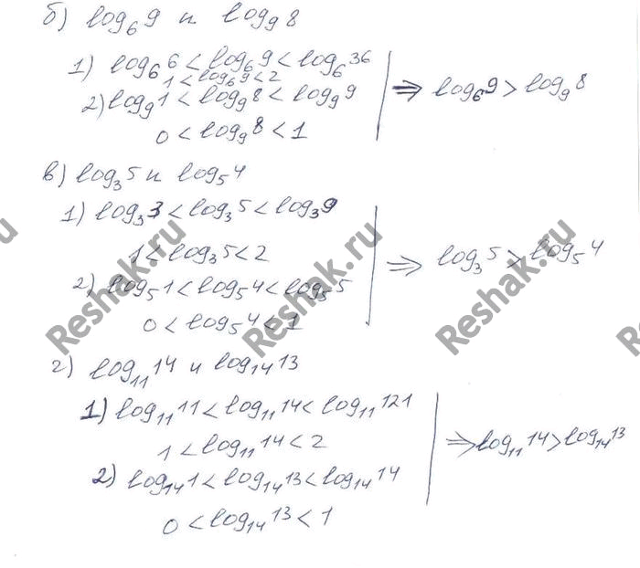 6) log6(9) и log9(8); r) log11(14) и log14(13).