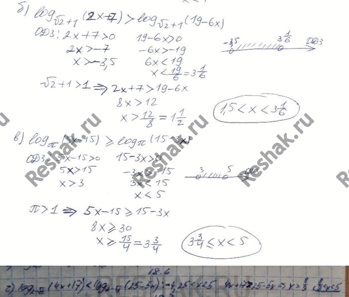 в) log Пи(5x - 15) больше или равно log Пи(15 - 3x);