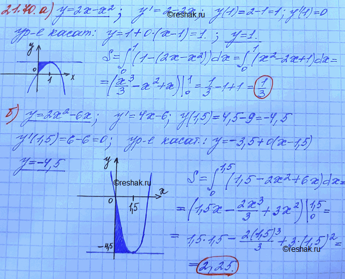 21.70. а) Найдите площадь фигуры, ограниченной параболой у = 2х - х2, касательной к ней в точке х = 1 и осью у.
