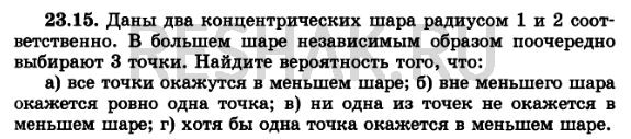 23.15. Даны два концентрических шара радиусов 1 и 2 соответственно. В большем шаре независимым образом поочередно выбирают 3 точки. Найдите вероятность того, что: