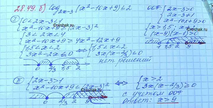 28.49 а)logx(21-4x) > 2; б)log(2x-3)((x2 - 10x + 9)) меньше или равно 2.