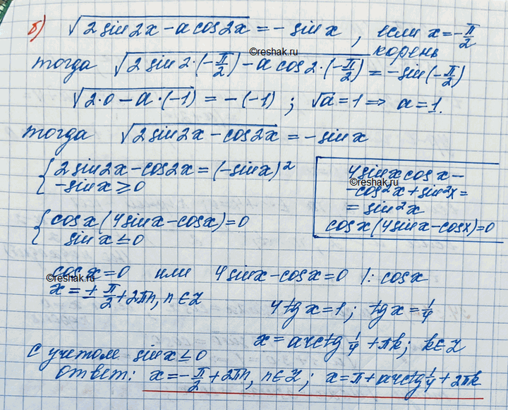 б) корень 2 sin 2х - a cos 2х = -sinx, если известно, что х = Пи/2 — корень уравнения.