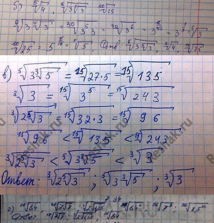 7.34. а) корень 3 корень 3 степени 4; корень 3 степени 5 корень 3 и корень 6 степени 100;
